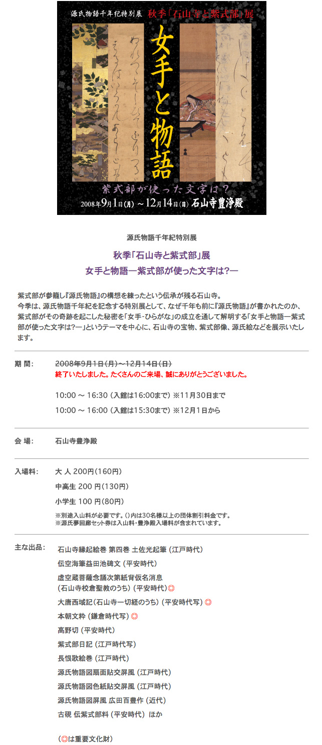 2008年 源氏物語千年紀特別展 秋季 石山寺と紫式部展 「女手と物語―紫式部が使った文字は?―」