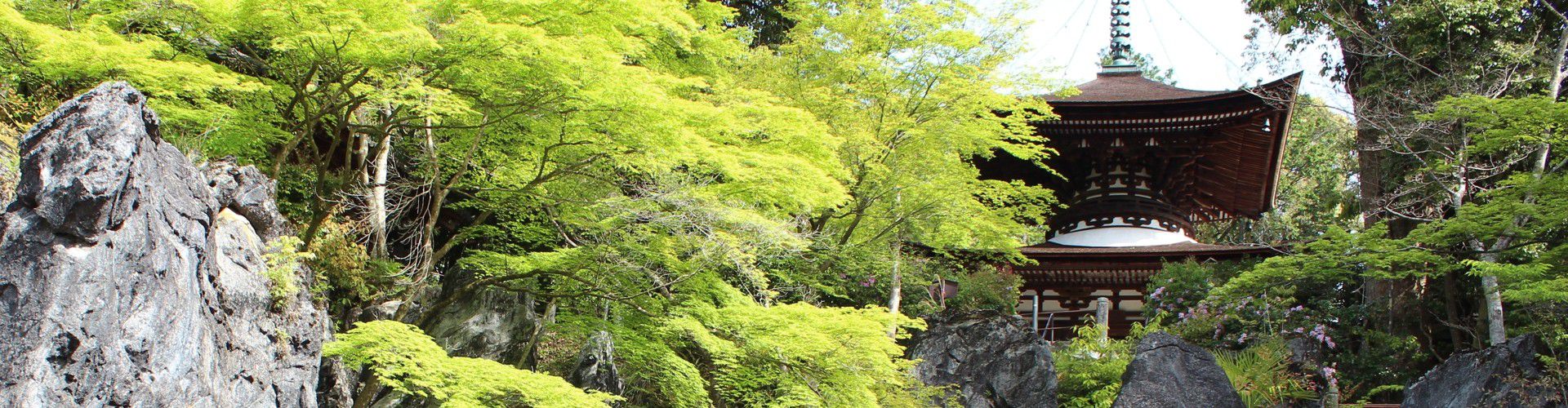 多宝塔は硅灰石の上方にそびえ建つ国宝建築です。源頼朝公に寄進されたと伝えられ、下層の須弥壇上框裏面の墨書から建久5年(1194)に建立されたことが判明しています。建立年代が明らかな多宝塔の中でもっとも古い多宝塔であり、鎌倉時代の当初の形を保つ遺構として貴重です。上層は円形、下層は方形平面の二重の塔で上下二層のバランスや軒の曲線の美しく、日本が誇る最古にして最美の多宝塔として知られています。